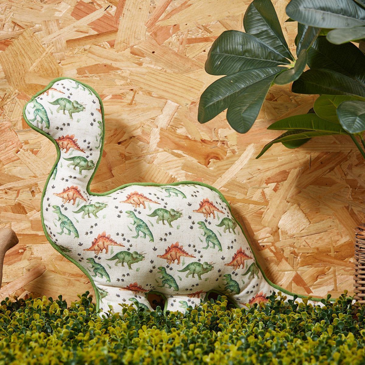 Super cute dinosaur shaped cushion with repeat pattern and green piping to the edge!